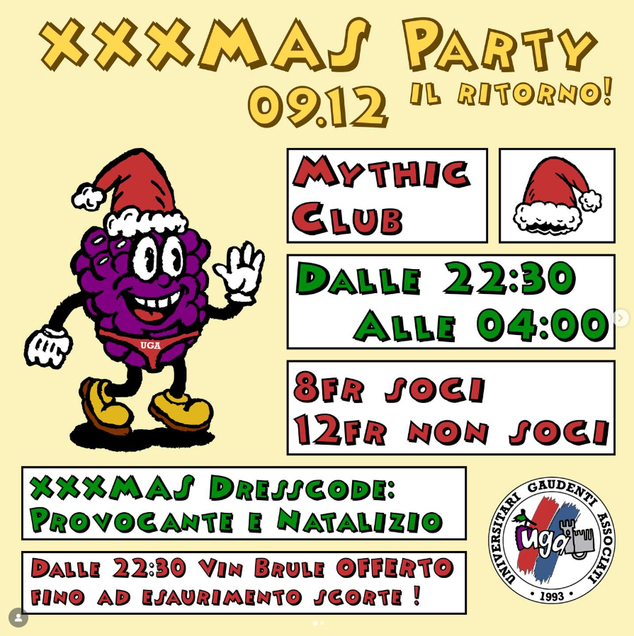 UGA X-MAS PARTY 9 décembre 2025 Tuesday 22:30 Buy UGA X-MAS PARTYStudents party, hits & more… Facebook Events :: > GUEST DJ :: Portes : 22h30Entrée : prélocations::18 ans révolus Previous Next